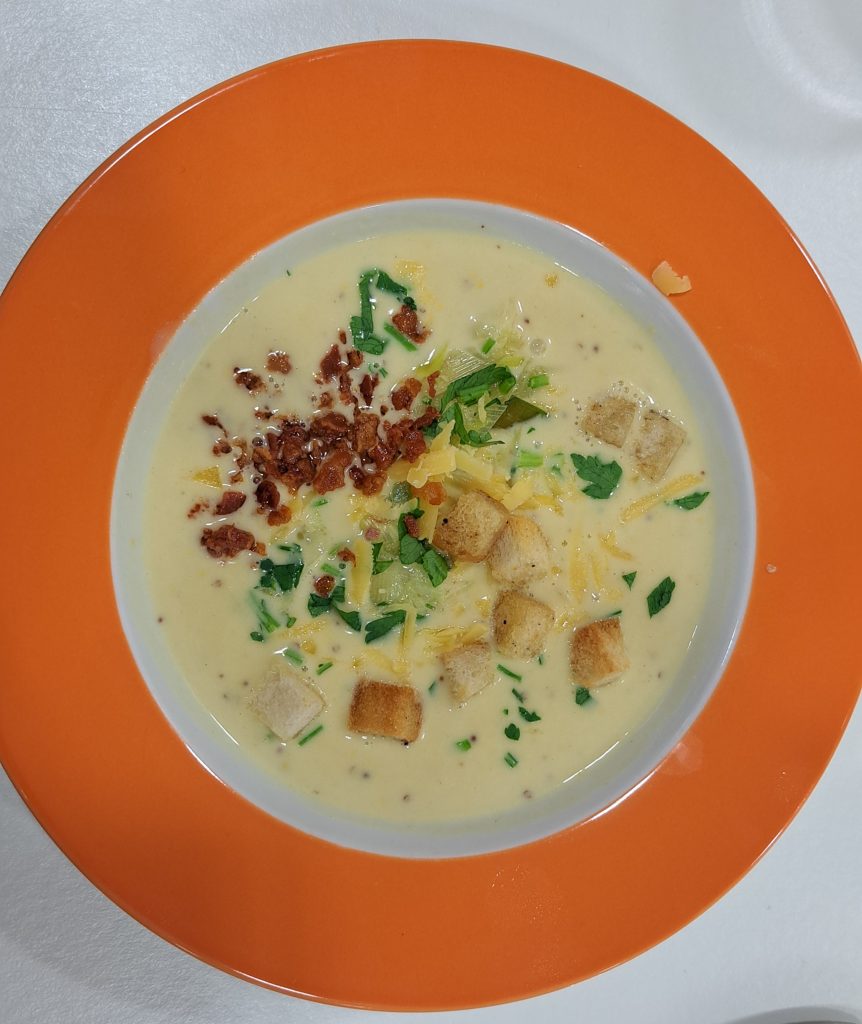 Zum Auftakt gab es eine Groninger SenfsuppeMosterdsoep, eine cremige Spezialität aus der Provinz Groningen, bei der der kräftige Senfgeschmack durch Lauch, Sahne, Zwiebeln und Speck verfeinert wird.